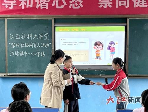 大江新闻讯 (通讯员彭新兰)为落实立德树人根本任务,帮助学生提升人际交往能力,近日,宜春市袁州区洪塘镇中心小学联合江西省社科大讲堂开展“快乐同伴,好好说话,一起修炼相处与沟通的秘籍”心理健康教育活动。