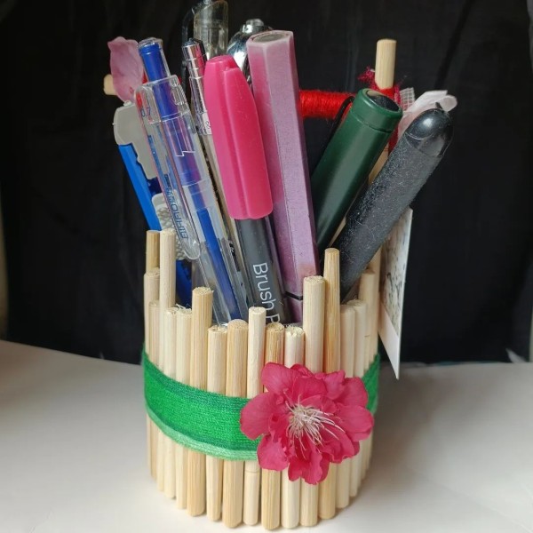 该作品主要使用塑料瓶、一次性筷子(二次回收)和废毛线制作而成的,目的是为了告诉人们用常见的可回收利用的物品可以制作出精美的小物件,加强这种材料的回收率,减少浪费,并达到一个赏心悦目的效果。此物品的用途:笔筒、香薰盒、插花、养绿萝等。