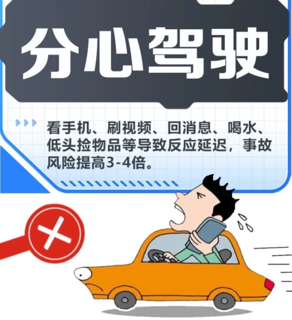 分心驾驶发生事故的风险是正常驾驶的4倍。驾车途中,请集中精力,不要接打电话、抽烟等,严防分散注意力。谨记:安全细节虽小,忽视易酿大祸!