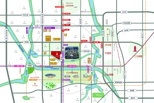 商业配套:万达商场(金马凯旋),中原科创绿谷,中原万达等建筑/