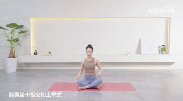 收腹部,吸气双手向上高举过头顶,十指交扣翻转掌心向上推,感受肩胛骨向下沉,背部挺拔向上,把肋骨和腹部收进去,掌根内侧继续向上,找到胸腔和腋窝有打开的感觉,呼气双手解开落回身体两侧。