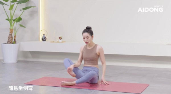 盘腿坐姿,手扶膝盖,脊柱向上挺拔。吸气双臂提起,呼气时身体向右边侧弯,右手落向地面,左大臂贴着耳朵,手指尖伸向右上方。身体向右,坐骨左侧下沉,身体慢慢向下,目视前方。呼气回到坐姿,换到对侧重复。每次保持5-6个呼吸。