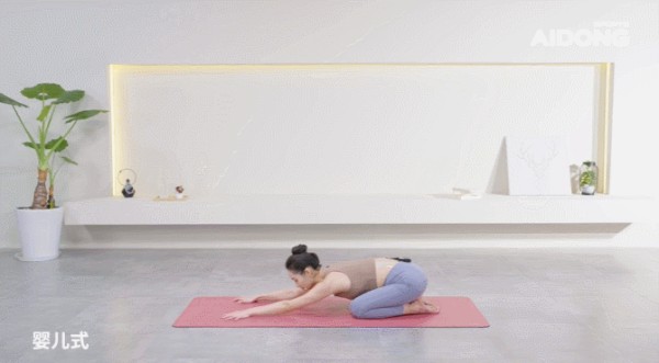 保持在婴儿式的中立位,收腹部,臀部不要离开脚跟。双手带动身体向右侧斜前方延伸,感受左侧腰、后背的伸展,可以不断地向前向远。吸气时,收腹部双手带动身体回正,换到对侧重复。