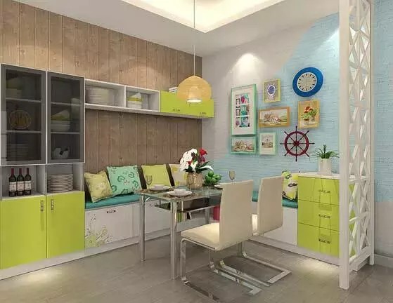 如果希望用餐区形成一个独立空间,可以做一个转角餐边柜和小屏风。餐具、酒杯和好酒放在上面的柜子里。下面的柜子、抽屉则适合放那些干燥的食材。