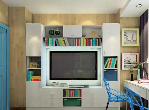 如果书房里也需要一台电视,那么可以把书柜设计成回字形。