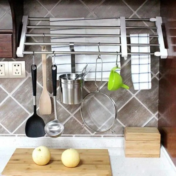 在厨房台面空白的地方,安上一个伸缩杆,用来收纳厨房厨具、小物品,显然是特别好的,造型简洁,收纳容量大,在厨房效果极佳。