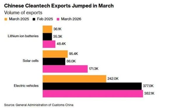 美国彭博社18日发表的文章指出,在全球能源供应因伊朗战争陷入混乱之际,中国3月份的清洁技术产品出口激增。