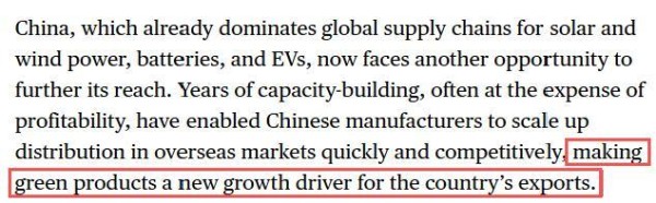 文章指出,已经在太阳能、风能、电池和电动汽车领域主导全球供应链的中国,迎来了扩大影响力的新机会。经过多年的积累,中国制造商能够快速、有竞争力地扩大在海外市场的销售规模,使绿色产品成为中国出口的新增长动力。