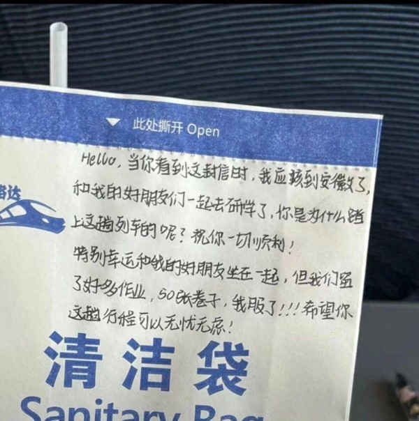 “Hello,当你看到这封信时,我应该到安徽了,和我的好朋友们一起去研学了。特别幸运和我的好朋友坐在一起,但我们留了好多作业,50张卷子,我服了!!!”近日,一张高铁清洁袋上的留言在社交媒体刷屏,原来是一个参加春假研学的孩子写的。字迹工整、文字单纯可爱,但50张卷子后面的三个感叹号令人心疼。
