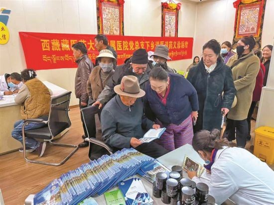 图为西藏藏医药大学附属医院党总支在扎细新村社区藏医馆开展送医送药义诊活动。