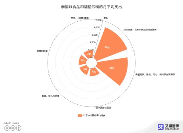 泰国非食品及酒精饮料月均支出数据分析:“公共交通、私家车燃油及通信服务” 支出最高,达4268泰铢