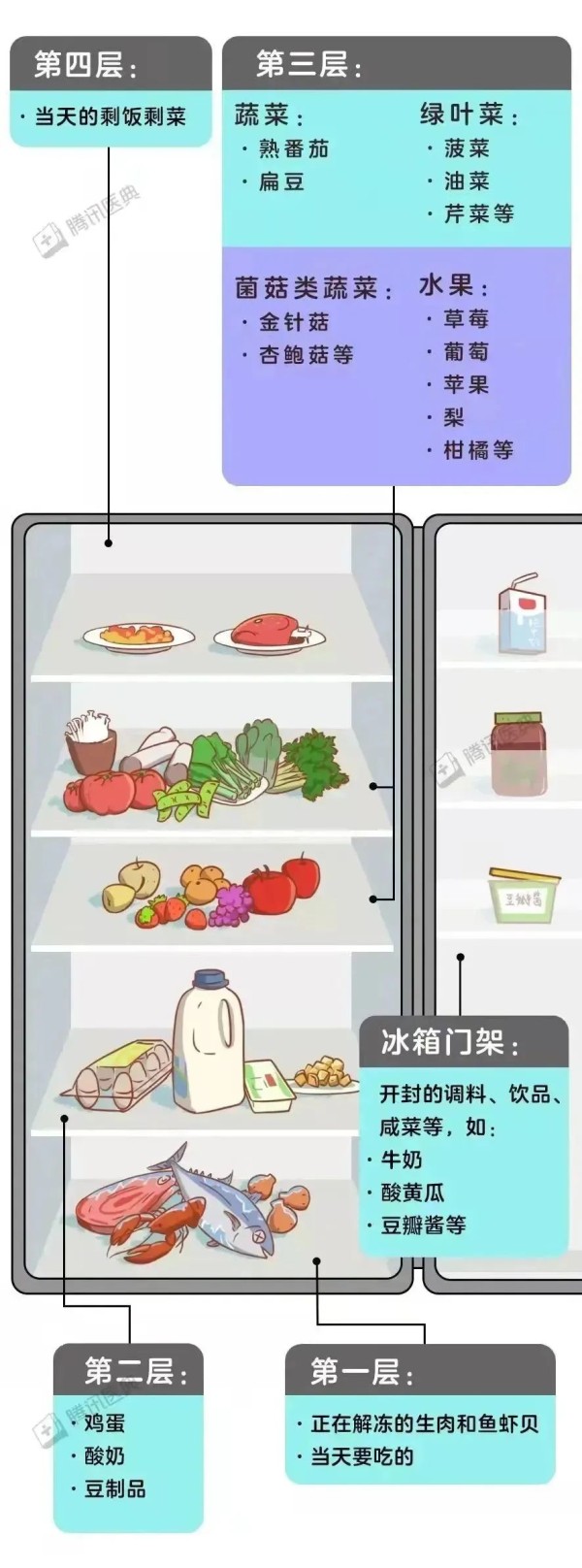 再送给大家一张冰箱食物正确存放顺序图,你可以对照一下家里的冰箱是不是符合标准~