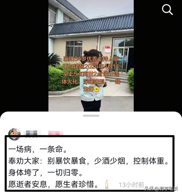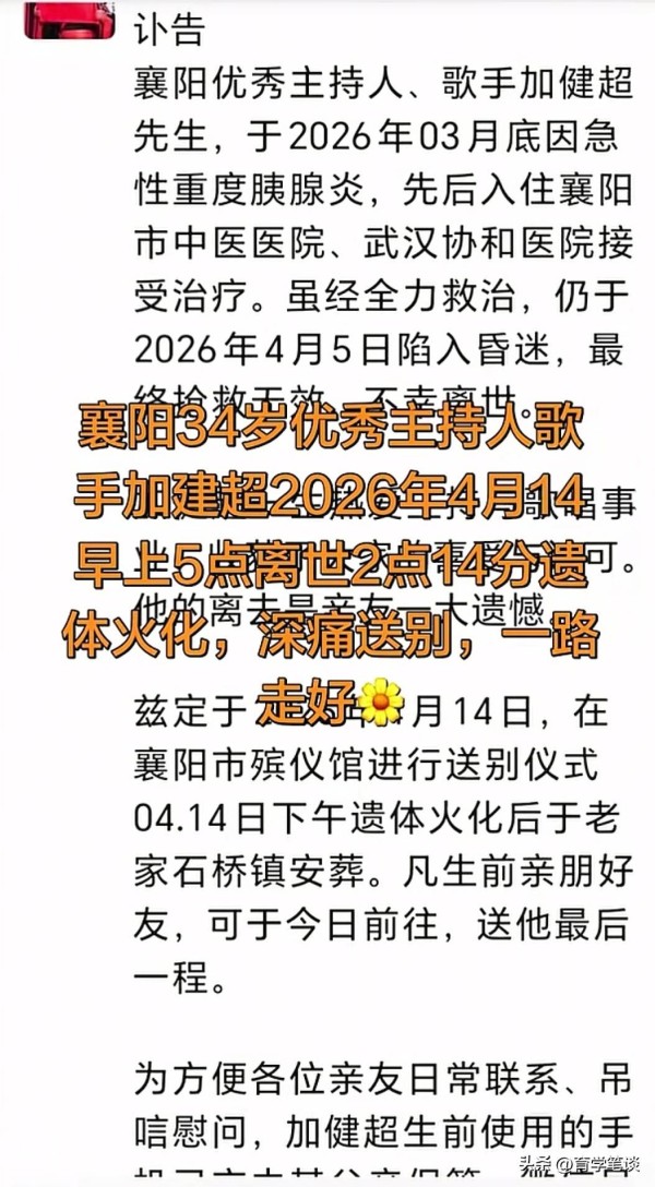 4月14日,一位网友在社交平台发文,悼念来自湖北襄阳的主持人兼歌手加健超。文字中写道,加健超已于凌晨5点悄然离世,年仅34岁;同日下午2点多,他便被安葬。这位网友特意前往现场,为他送上最后的告别。