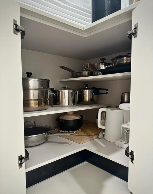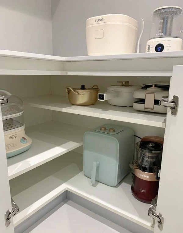 地柜的转角死角,装上“小怪物”或者蝴蝶转盘,里面的东西轻轻一拉就都出来了。