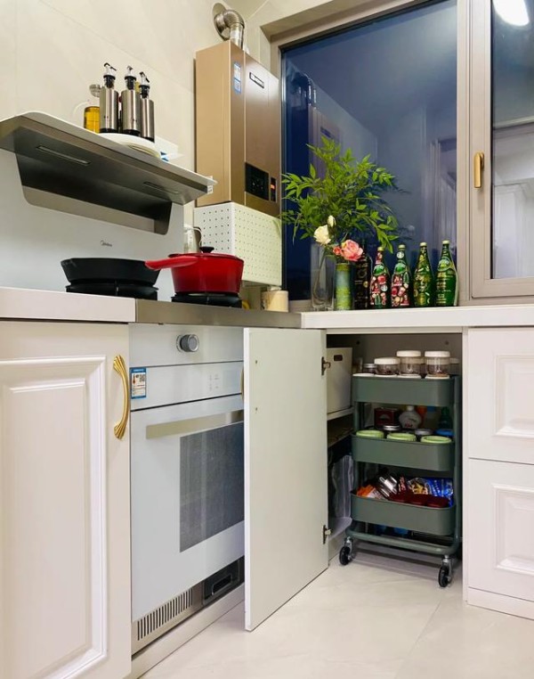 实在不够放,一个十几块钱的多功能小推车就能解决大问题,蔬菜、零食、工具都能装,还能随时移动到需要的地方,比固定死的吊柜灵活多了!