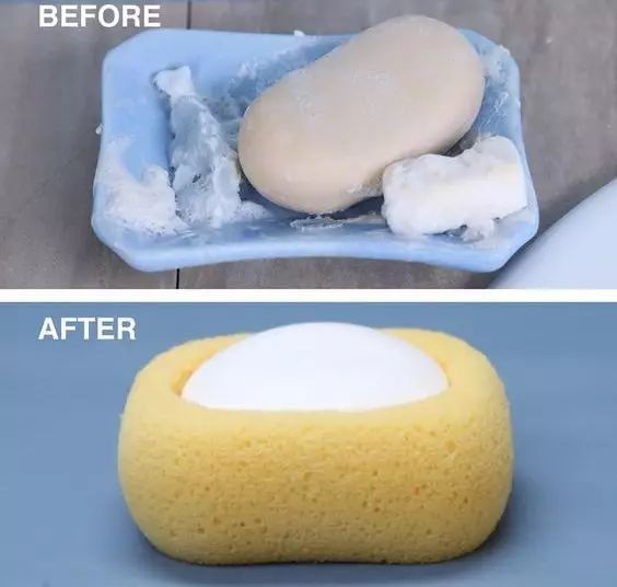 肥皂蘸水久放后湿湿黏黏的容易化掉,用一块百洁布垫着,百洁布能够吸走多余的水分,让肥皂一秒变干爽~