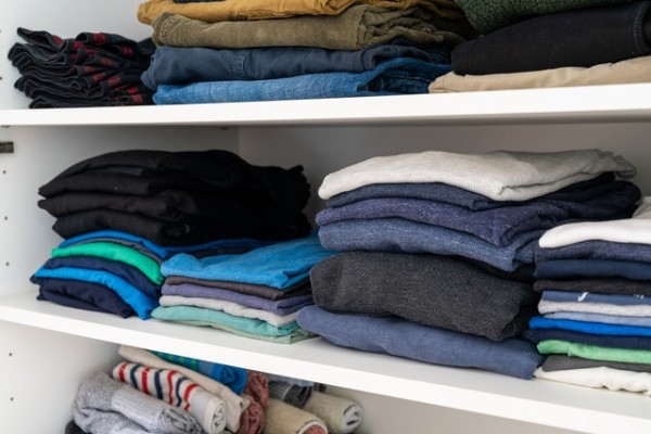 衣柜省空间:衣服卷起来放,比叠更省地。