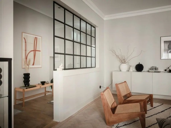玄关由半墙室内窗将客厅内外隔开,左侧是卧室,右侧是厨房,入户门在二者中间。