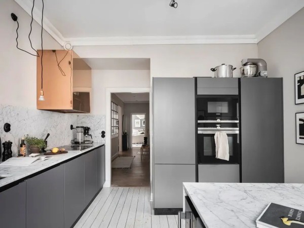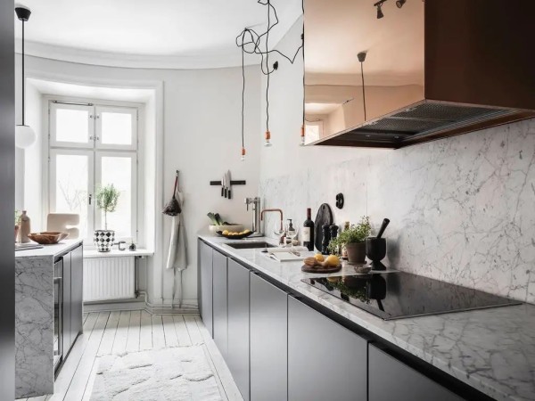 深灰色橱柜正面的简洁线条,与令人印象深刻的白色大理石台面和墙板完美搭配。