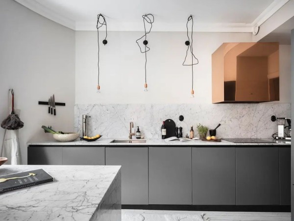 铜质油烟机与橱柜上方的不规则线性吊灯,是这个厨房的点睛之笔,给深灰色的橱柜起到提亮效果。