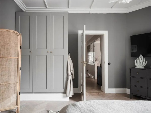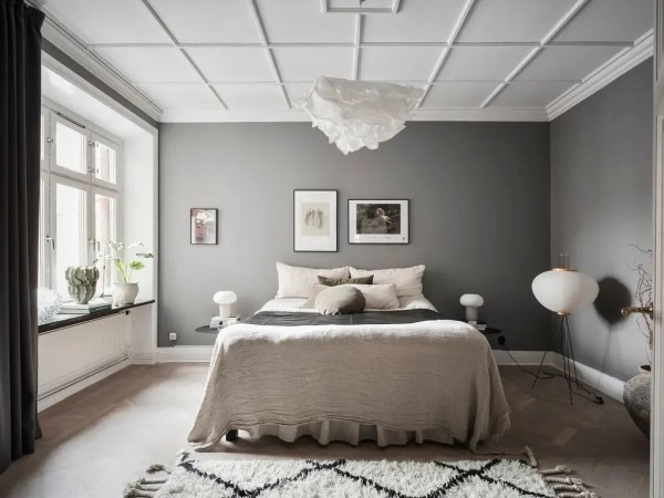 卧室通体灰色墙面和衣柜,搭配亚麻材质床品,花瓣纸质灯和床头灯、落地灯,三角构图很精美。