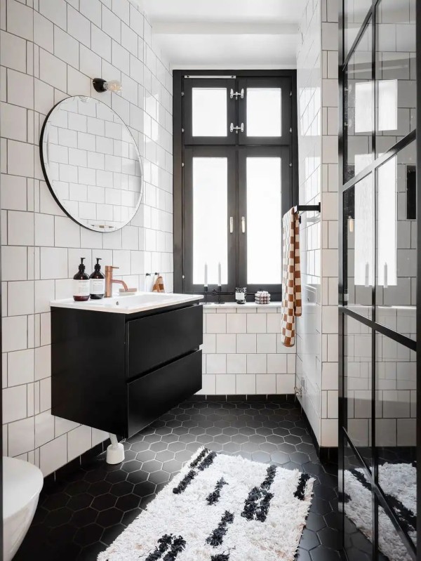 经典的黑白灰配色,墙面小白砖采用“工”字形贴法,地面铺黑色哑光六角砖,湿区同样用黑色金属边框玻璃门分隔。