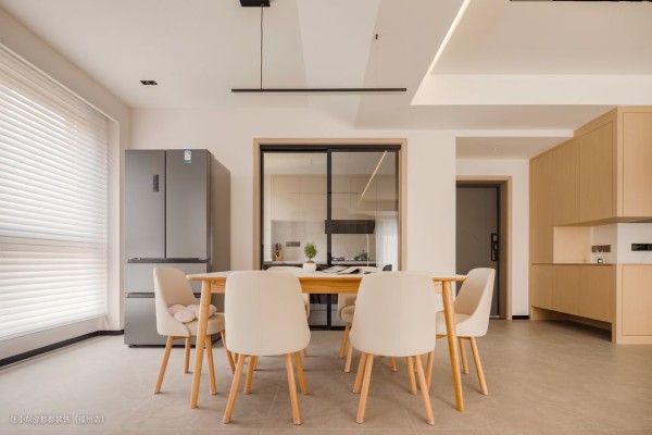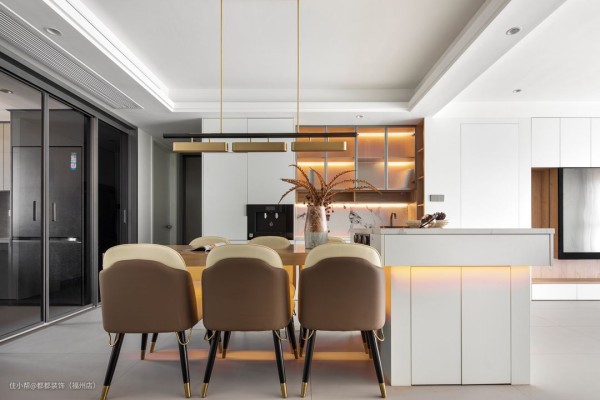 为了提高整体颜值,设计时,我们会进行色彩分割,区分岛台和餐桌各自的区域,让颜值在线。