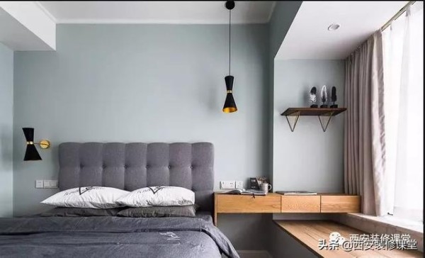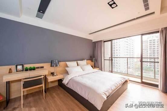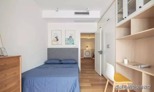 ▲普通卧室加书桌的做法,一般都是牺牲床头柜或者尺寸够用,书桌和化妆台兼顾的做法,是小户型比较实用的做法