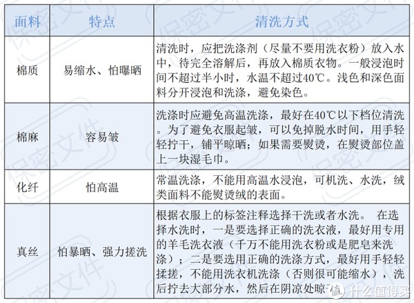 特别需要注意的是,洗涤脱水,不可暴力拧绞,不可滴干,而要平整挂干,这样能减少折皱。晾晒衣物要在干燥通风透气且阳光无法暴晒的地方,早上和傍晚阳光直晒问题倒不是很大。其他材质的衣物清洗方法及禁忌事项,我做了一张表,已经很清晰了,可以参考。