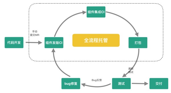 研发流程中的组件发版、组件集成与App打包都是持续集成中的标准化流程,我们通过流程托管工具来完成这几个步骤的自动衔接,研发同学只需关注代码开发与Bug修复。