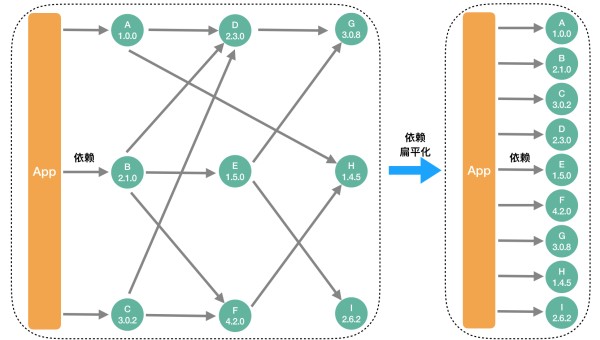 依赖扁平化的核心思想是事先把依赖项以及依赖版本号进行显示指定,这样通过固定依赖项以及依赖版本就彻底去掉了组件依赖计算的耗时,极大的提高了项目构建速度。与此同时,依赖扁平化还额外带来了下面的好处: