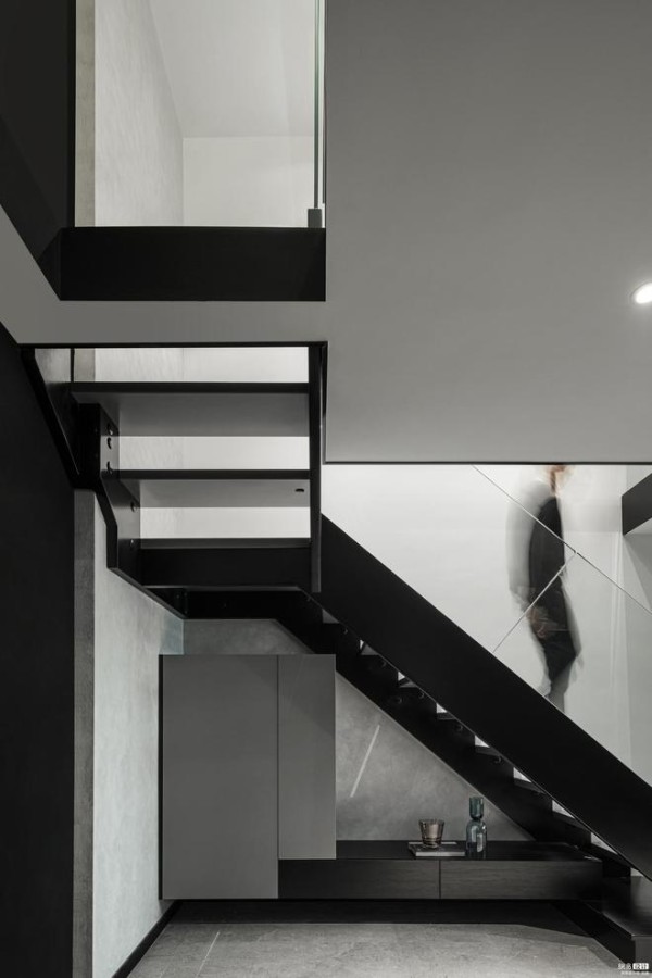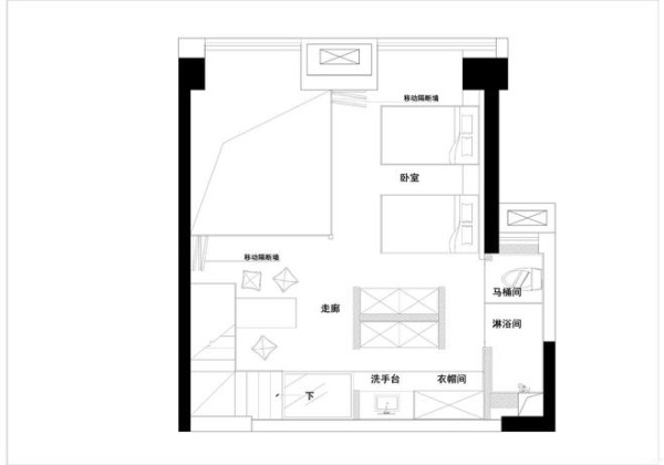 搭建后的二楼,也是充分考虑到居住舒适度、整体效果最优化而采用的方案。让客厅有着更大的挑空面积,能带来更优的通风、采光及开阔感。在楼上设置一个开放式卧室,并延续楼下形成另一个「洄游动线」:衣帽间+洗手台+淋浴间+马桶间+卧室。楼上的「洄游动线」形成的并不是单纯走廊而是多个并行的功能区:围绕动线一圈,我们设有大容量衣帽间、三分离的卫生间等。让居住者上楼之后马上能换衣、洗澡、睡觉。外出动线:洗脸、更衣、下楼,不走回头路。入住者后期一定会体验到这种设计所带来高效舒适的巨大便利。二楼的过道,是给入住者留出的自由角,居住者可以自行安排用途。此处靠近客厅挑空区,通风与采光很不错,可放一个小桌子和几个垫子,窝在这里看书玩手机,也可放置瑜伽垫做运动。另外,从这个自由角还能与楼下飘窗或卧榻上的人交谈互动。当楼上需要休息时候可以通过两侧设置的可移动隔断墙把这里关闭,以保证楼上人想休息时候不被楼下所打扰。。