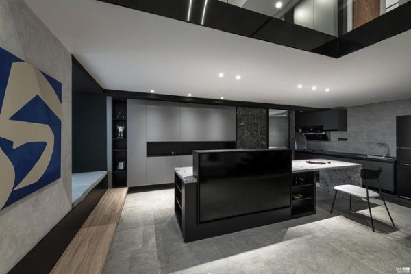 开发商原始设计为整体挑空,楼上可自由搭建。楼下有一个客厅和一个卧室,客厅开间很小。考虑到这类入住者通常喜欢精致的生活,喜欢大气通透的空间。我打破了刻板与常规、实现了空间的解构与重组,采用LDK的布局模式,将复合思维运用到设计当中,并打造多个洄游动线。