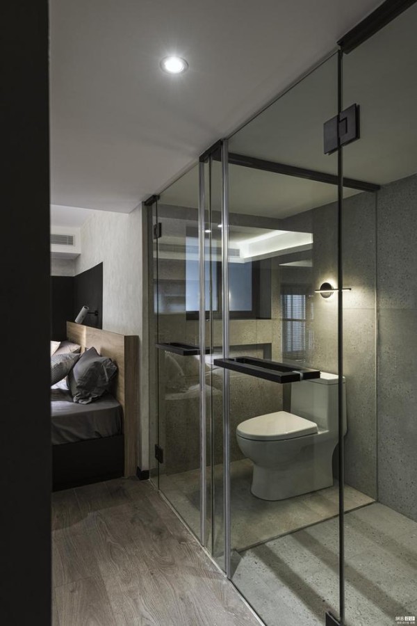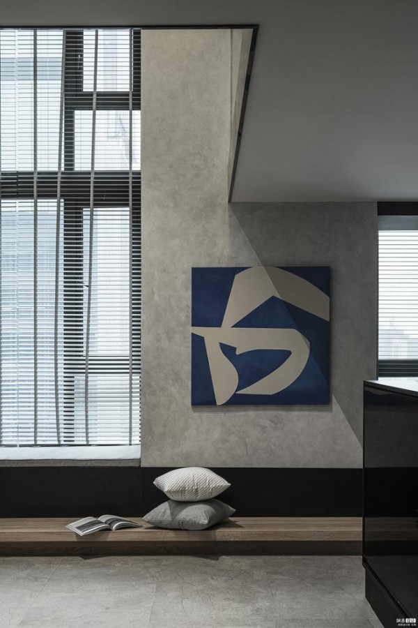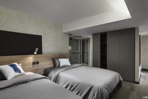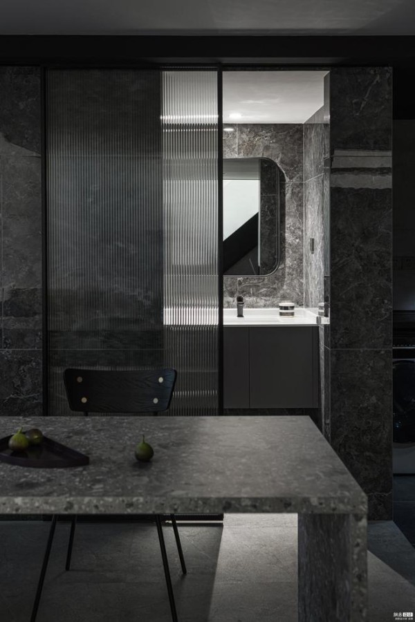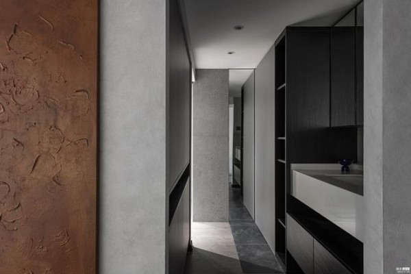 地面材质拼接转至墙面,并在墙体犬儒一块镜面,它除了可做更衣镜,也让空间视觉有延伸作用。