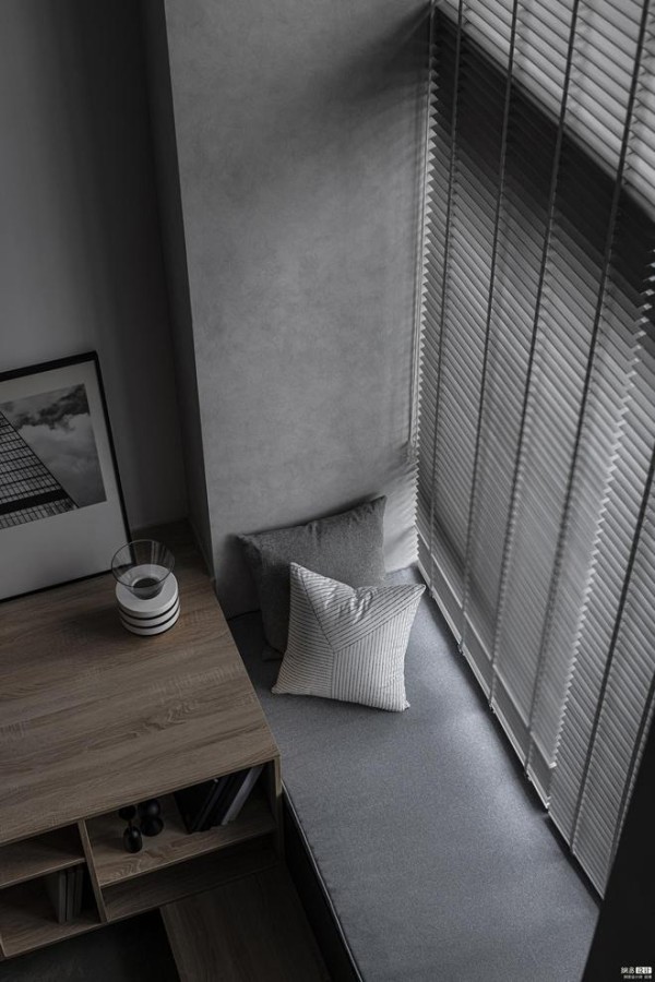 在年轻人的生活中,电视机似乎不再重要,但也不能没有。所以我们没有采用传统式的整面电视墙,而是巧妙将电视嵌入到中间书桌前的柜体里。