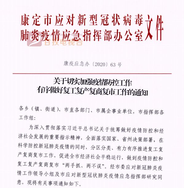 在科学防控新冠肺炎疫情的同时,如何分区分类、有力有序推进复工复产复商复市工作?近日,康定市应对新冠肺炎疫情工作领导小组、市应对新型冠状肺炎疫情应急指挥部联合下发了《关于切实加强疫情防控工作有序做好复工复产复商复市工作》的通知。