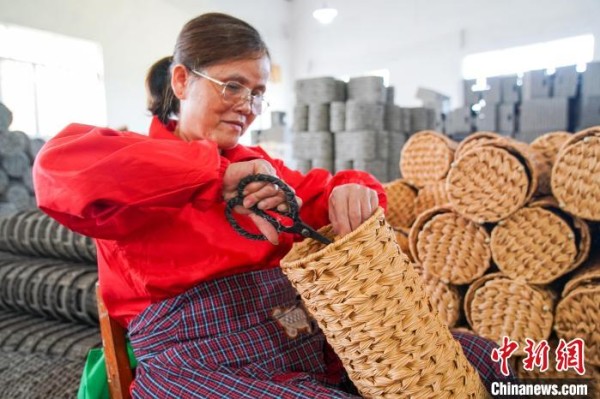 11月22日,广西博白县一家编织工艺品生产企业内,工人正在制作专供外贸的手工艺品。编织产业是博白县支柱产业之一,多年来产品远销欧美、中东、东南亚等40多个国家和地区。中新社记者 陈冠言 摄
