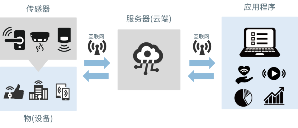 大致的流程框架是首先通过搭载有传感器和无线通信元器件的设备来获取对象的数据,并且经由互联网在云端或服务器中对数据进行累积和分析。之后,通过应用程序使数据可视化,并优化设备的使用方法。示意图如下。