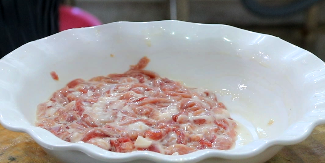 1. 肉片或者肉丝切好之后,用水冲洗一遍表面的黏膜,减少粘性,再攥干水分;