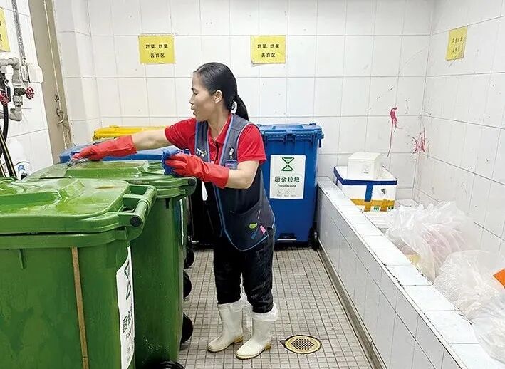 为确保厨余垃圾与其他垃圾完全分类,杜绝交叉存放,进一步细化厨余垃圾类别,如丢弃的面包、水果、菜叶等物品使用工具捣碎后放置厨余垃圾桶内,分切果盘时果皮与包装袋分别存放至厨余垃圾桶与其他垃圾桶内。保洁员在垃圾房进行桶边督导、检查并二次分类,确保正确分类。做到垃圾及时清运、及时消毒,减少异味及细菌繁殖,每天运垃圾时间避开鲜食收货时间,避免交叉污染等。