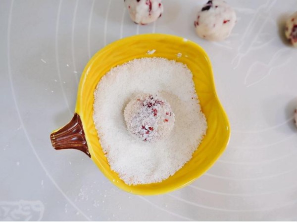 步骤八、把团好的山药球放在椰蓉中滚一圈,让表面均匀的裹上椰蓉即可。