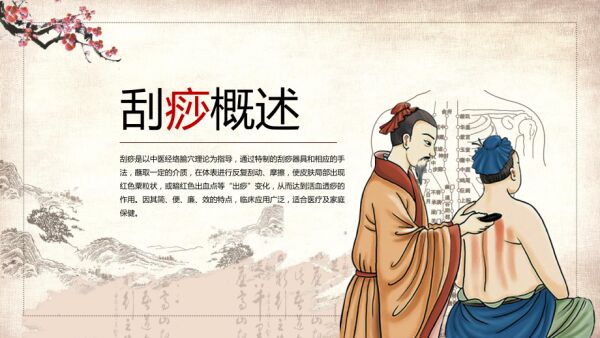 刮痧是以中医经络腧穴理论为指导,通过特制的刮痧器具和相应的手法,蘸取一定的介质,在体表进行反复刮动、摩擦,使皮肤局部出现红色粟粒状,或暗红色出血点等"出痧"变化,从而达到活血透痧的作用。因其简、便、廉、效的特点,临床应用广泛,适合医疗及家庭保健。还可配合针灸、拔罐、刺络放血等疗法使用,加强活血化瘀、驱邪排毒的效果。