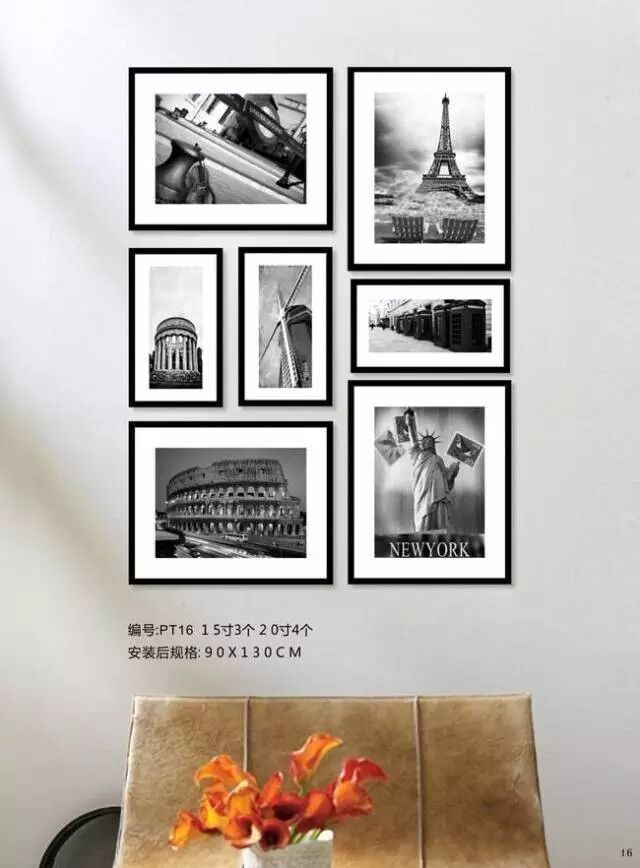不要忽视相框的装饰作用,相框内可以有很丰富的装载物,镜面、摄影作品、绘画、纸雕、绣品等等,再根据周边环境配合不同的尺寸和挂法,空间即刻美感指数大涨。