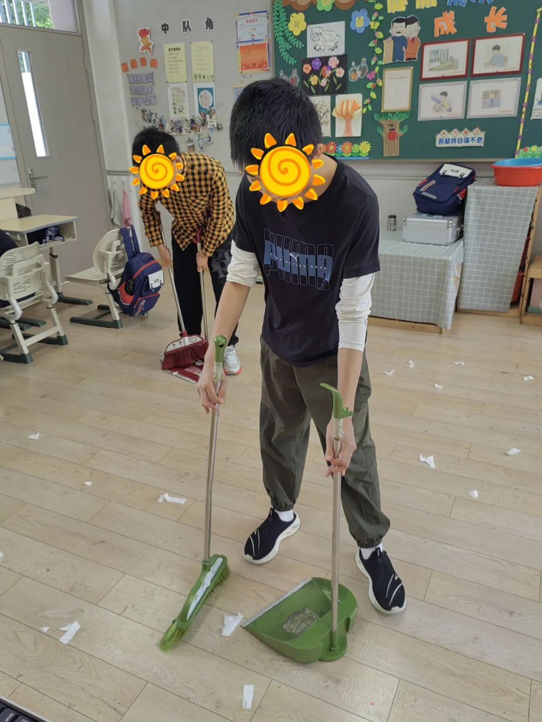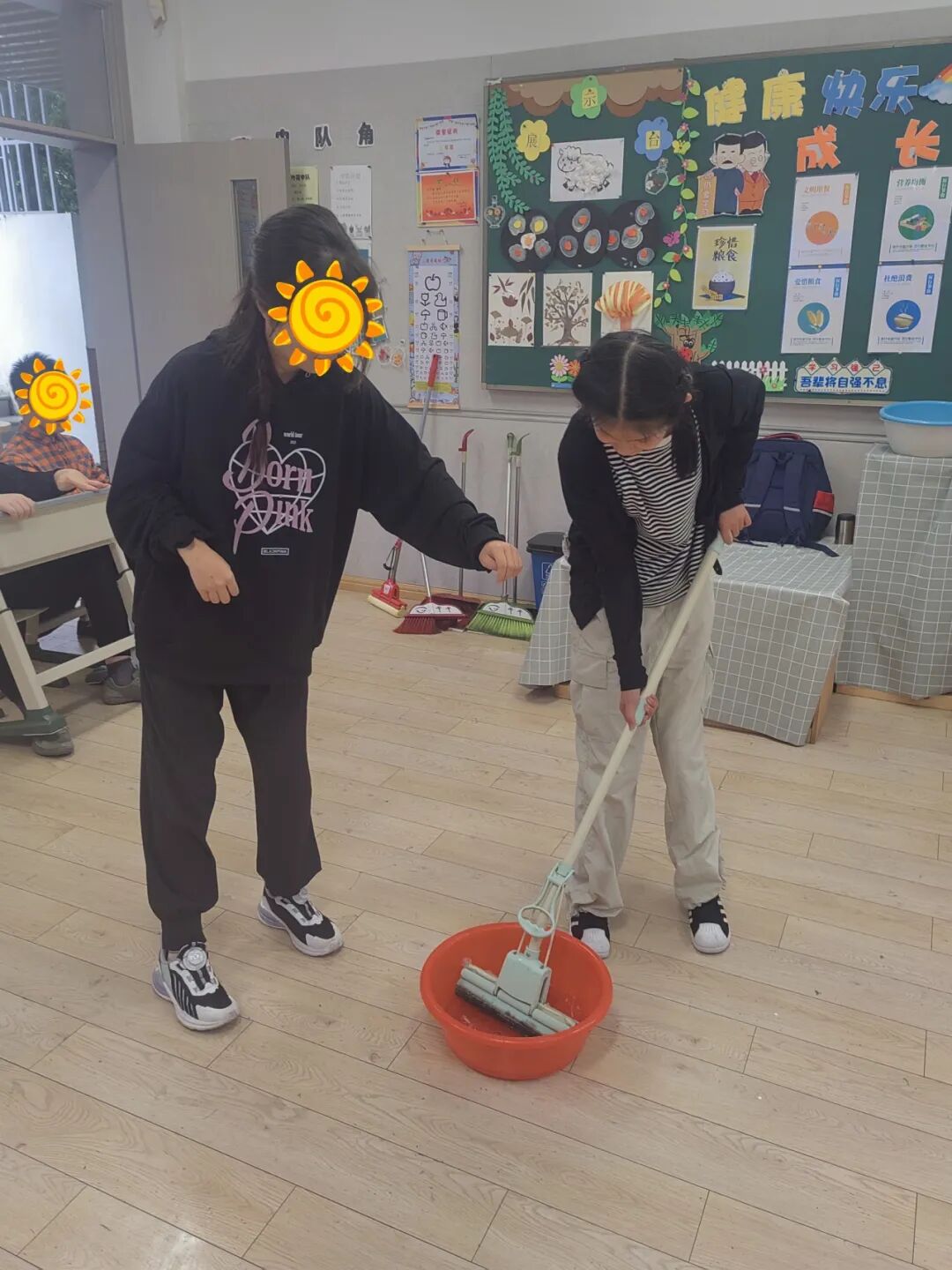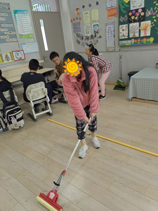 清扫地面的同学也很专注,他们有的把垃圾扫成一堆,有的一手拿畚箕,一手拿扫把,还有的你拿着畚箕,我把垃圾扫进来,大家共同协力,把地面扫得干干净净。拖地的同学干得可更卖力了,先清洗拖把,然后按照“拖——抬——拖——抬”的工作程序拖地,瞬间就把地板拖干净啦!