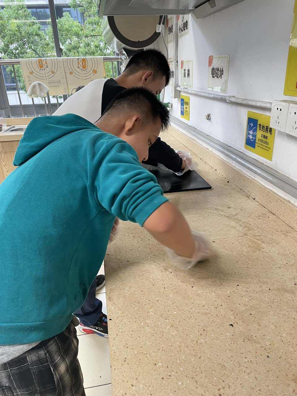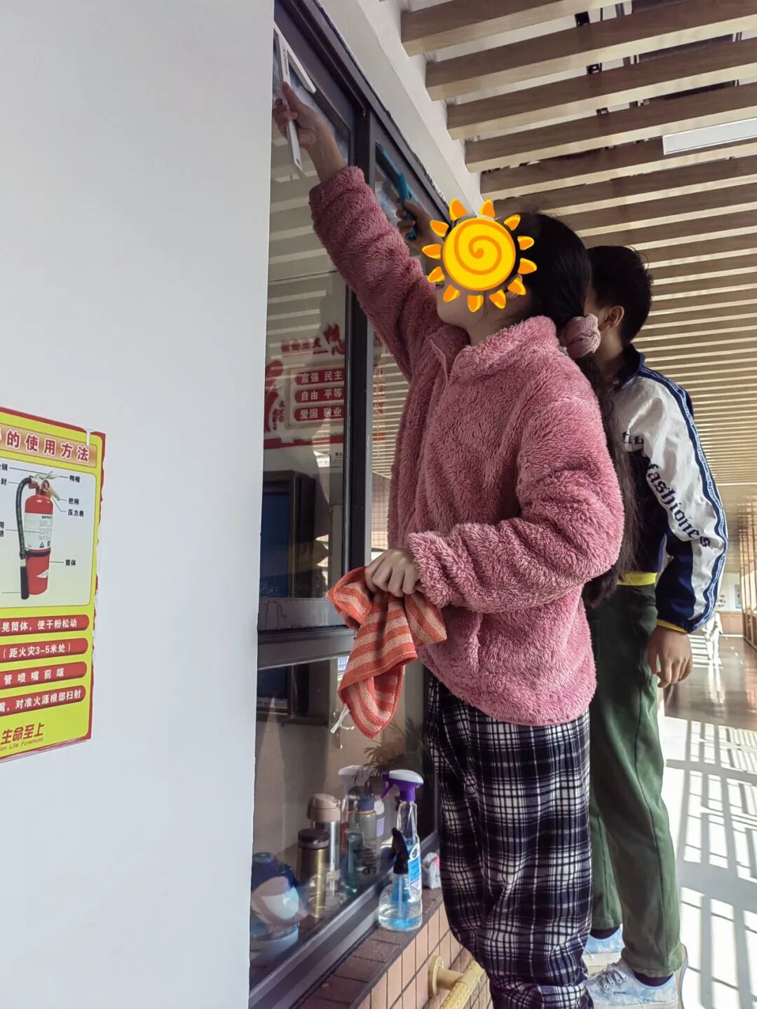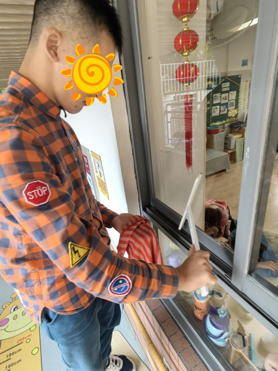 这些同学可厉害了,看他们像勇士一样爬上了桌子,稳稳地站在桌子上面,一手拿着刮刀从上到下刮玻璃,另一只手及时擦干净刮刀和多余的水,两手相互协调把玻璃擦得透明如镜。