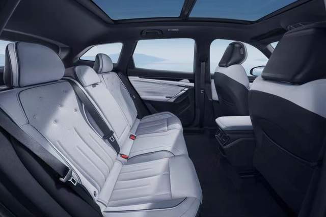 比较炫酷的是,日行灯在点亮后会和中间的白色logo一起点亮,就会形成完整的横向贯穿灯带效果,前后大灯均采用了横向贯穿设计,互相呼应。大面积格栅下方则是熏黑的气流疏导口,这部分可以将迎面撞击的气流向下打散,减少风阻系数,也让整个前脸更富有科技感和未来感。