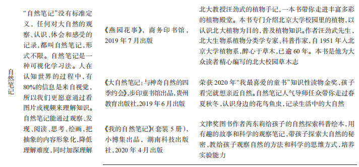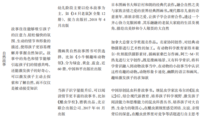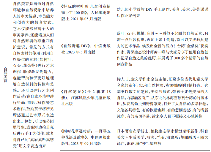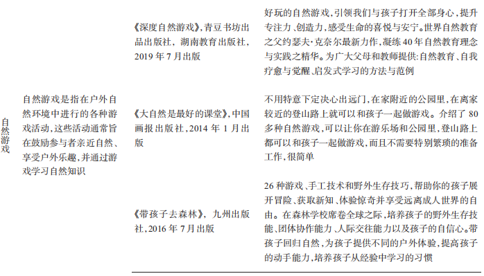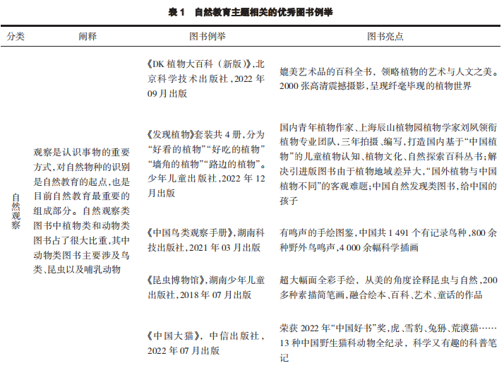 现按照自然观察、自然美育、自然故事、自然笔记、自然游戏等分类,介绍自然教育主题相关的优秀图书,如表1所示。