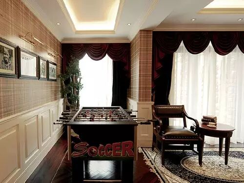 ◊浓郁欧美风的桌上足球台,设在客厅一隅,搭配格子墙纸与复古腰线,散发独有的英伦风情。