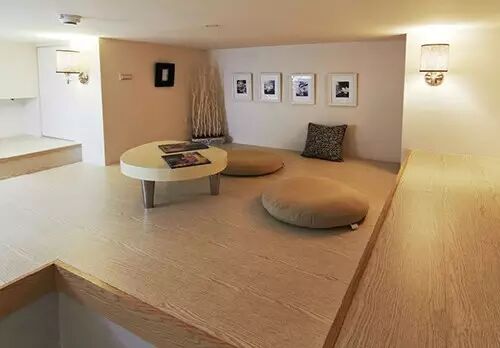 ◊架高的地面,铺以原木香醇的日式榻榻米,极简的空间配置,塑造宁静惬意的氛围,屋主可在此品茶、阅读或休息。