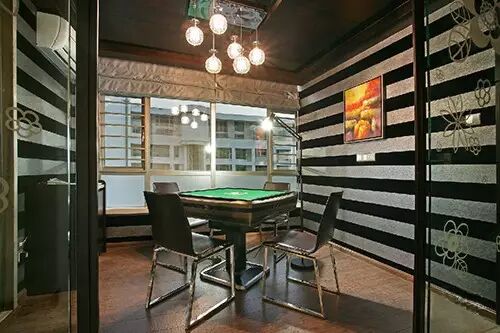 ◊麻将桌,设清玻镜花纹推拉门,隔绝噪音,并规划入温馨吊灯栈,营造有别于传统冰冷的游戏区。